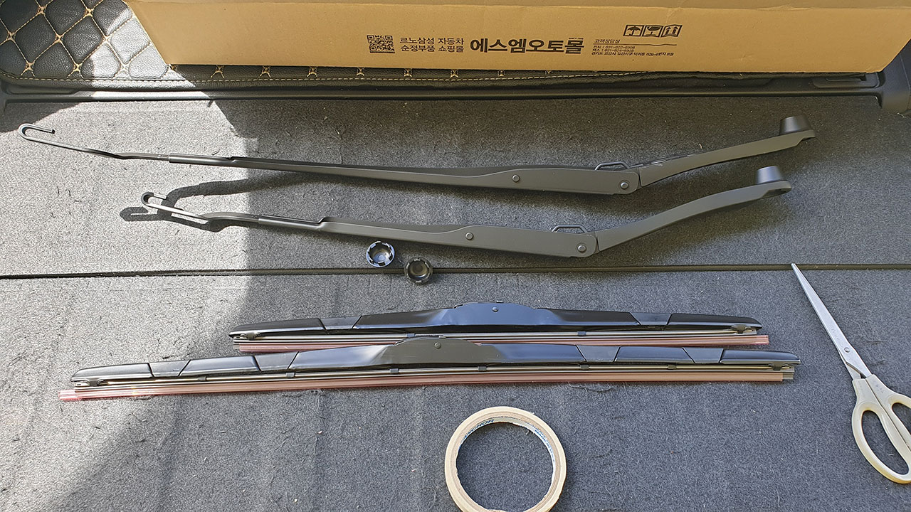 - 장착 시 미리 종이테이프로 표시해 둔 기존 와이퍼 위치에 맞춰서 고정합니다.