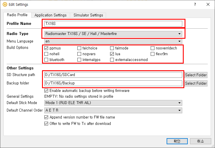 - 라디오타입은 TX16S를 선택해 줍니다.