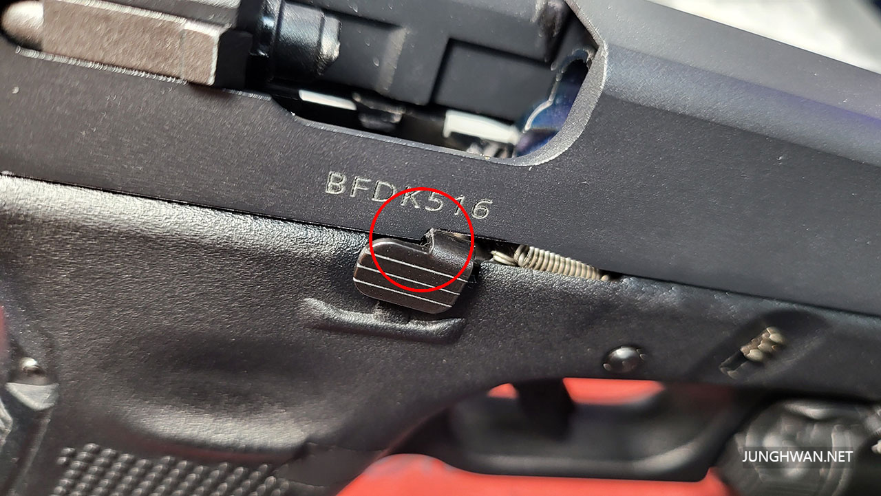 위 사진은 슬라이드가 후퇴 고정된 상태인데 우측에는 아예 걸리지 않네요.