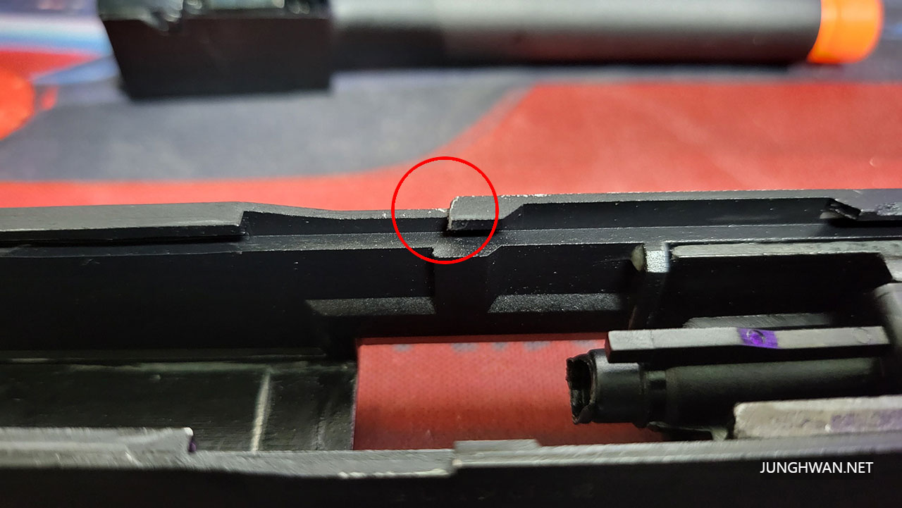 한쪽만 걸리는 상태에서 슬라이드 전진시 당겼다 놓지 않고 스토퍼를 내려서 전진시키는 동작을 계속하며 가지고 놀다 보니 약한 슬라이드 쪽이 갈려나간 걸로 예상이 되네요 ㅎㅎ