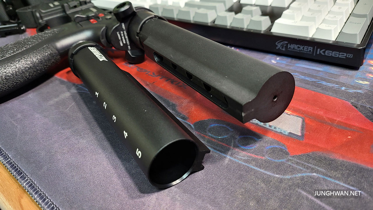교체용 스톡세트에 포함된 스톡튜브는 뒷부분이 뻥 뚤려있어서 스톡을 끝까지 뺐을때 걸리지 않고 그냥 빠져버리더군요.