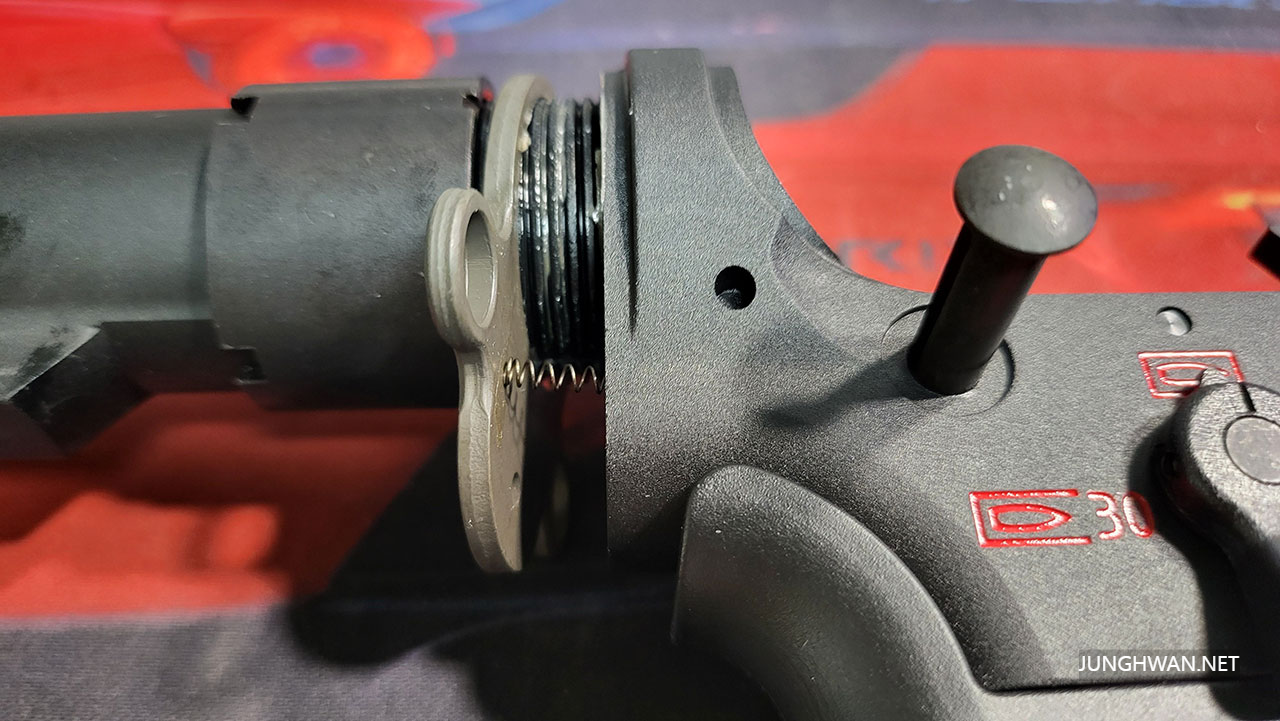 스톡튜브 너트를 풀고, 슬링고리 제거 시 테이크다운 핀 고정용 스프링이 손상되지 않도록 조심해야겠더군요 ㅎ