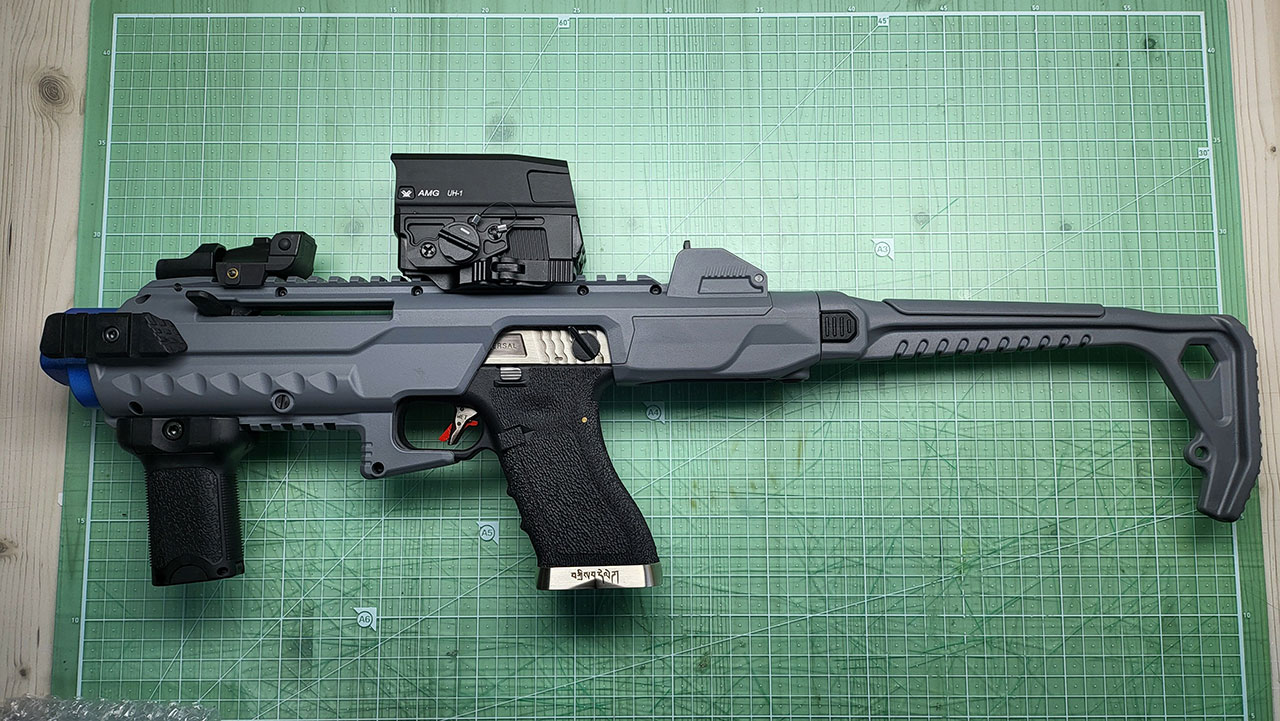 이번에 소개해 드릴 아이템은 핸드건을 라이플 또는 PDW로 변경할 수 있는 컨버전 킷 중 글록이나 AW VX시리즈에 사용할 수 있는 AW(아모러웍스)의 카빈 킷입니다. 그레이 색상입니다. 사진으로 봤