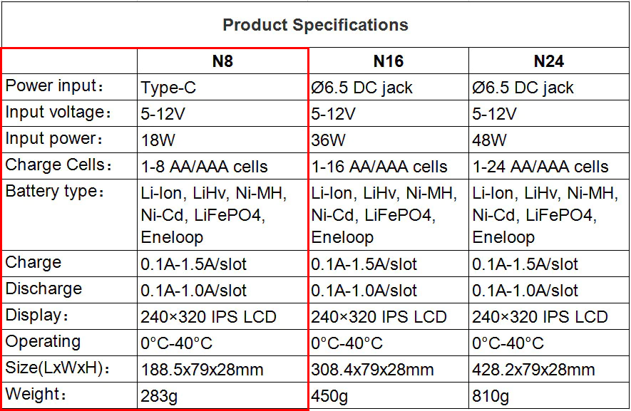 N8, N16, N24이며, N뒤의 숫자는 동시 충전 가능한 배터리 개수 있습니다. ㅎ~
