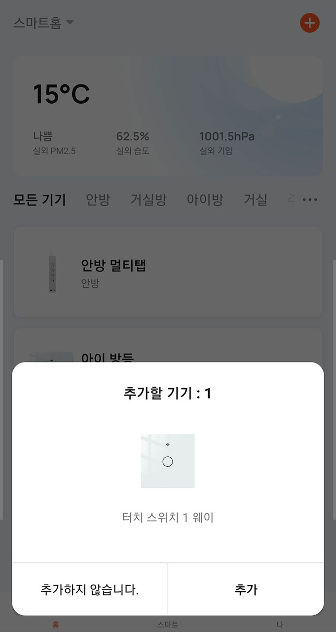 스마트스위치의 경우 Tuya Smart앱을 실행하면 자동으로 인식합니다.