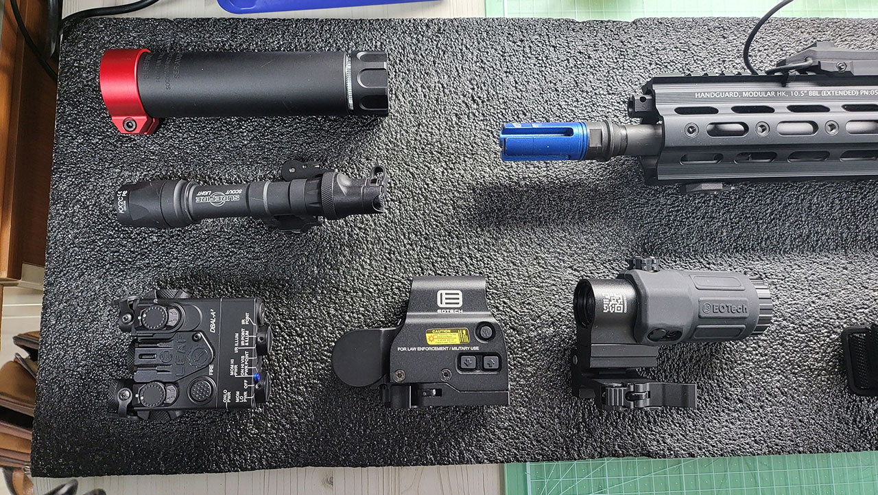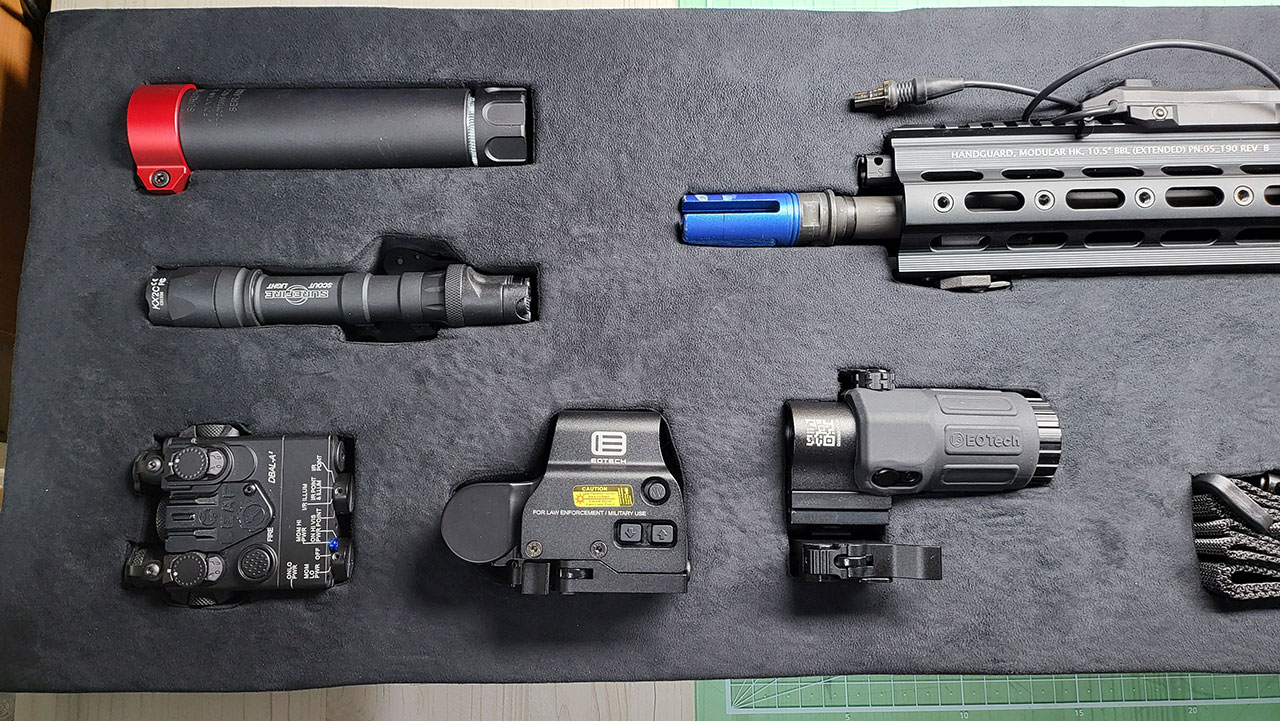 폼 위에 라이플 및 부착물들을 배치 합니다.