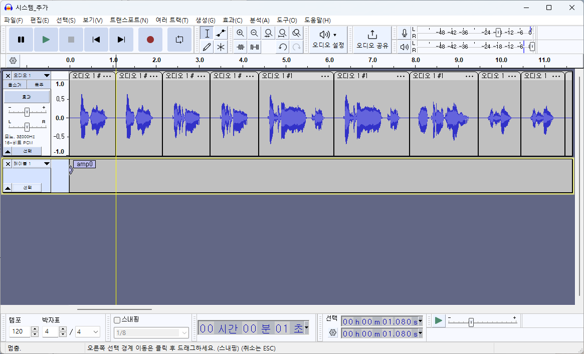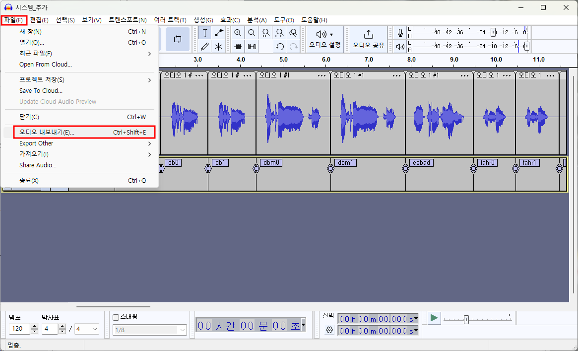 분할된 음원을 시작 부분을 마우스 왼쪽버튼으로 클릭한 후 메뉴에서 "선택에 레이블 추가"를 선택해 줍니다.
