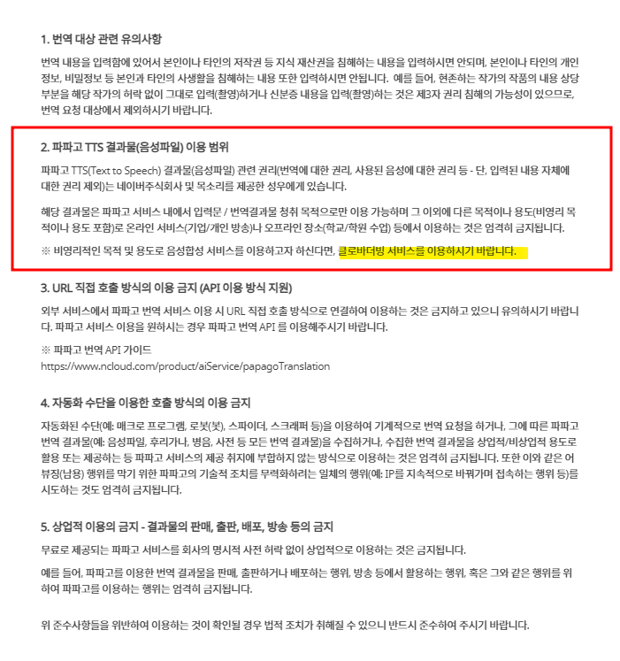 파파고의 라이선스를 확인해 보면 파파고는 파파고 번역물을 읽어주는 용도만 가능하며, 다른 용도로의 변경을 불가하며,