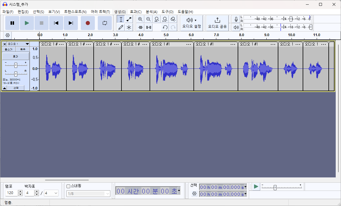 전체 녹음의 제일 앞부분과 끝부분을 잘라서 삭제하고 모든 음원을 분할해 주었습니다.
